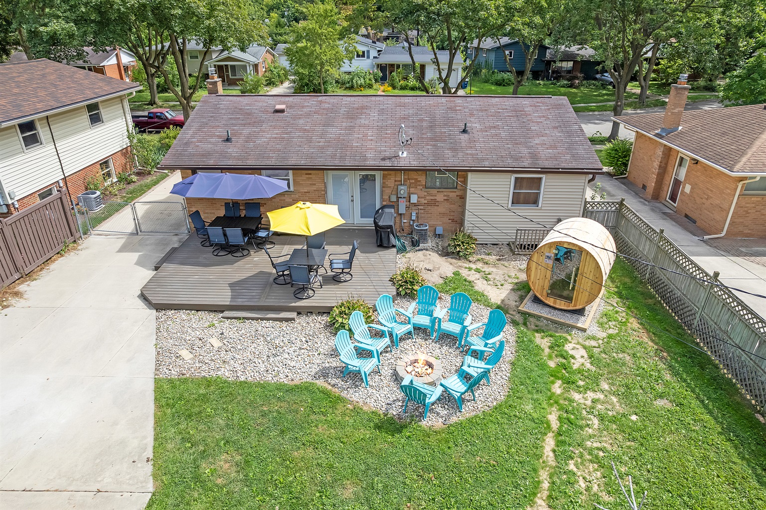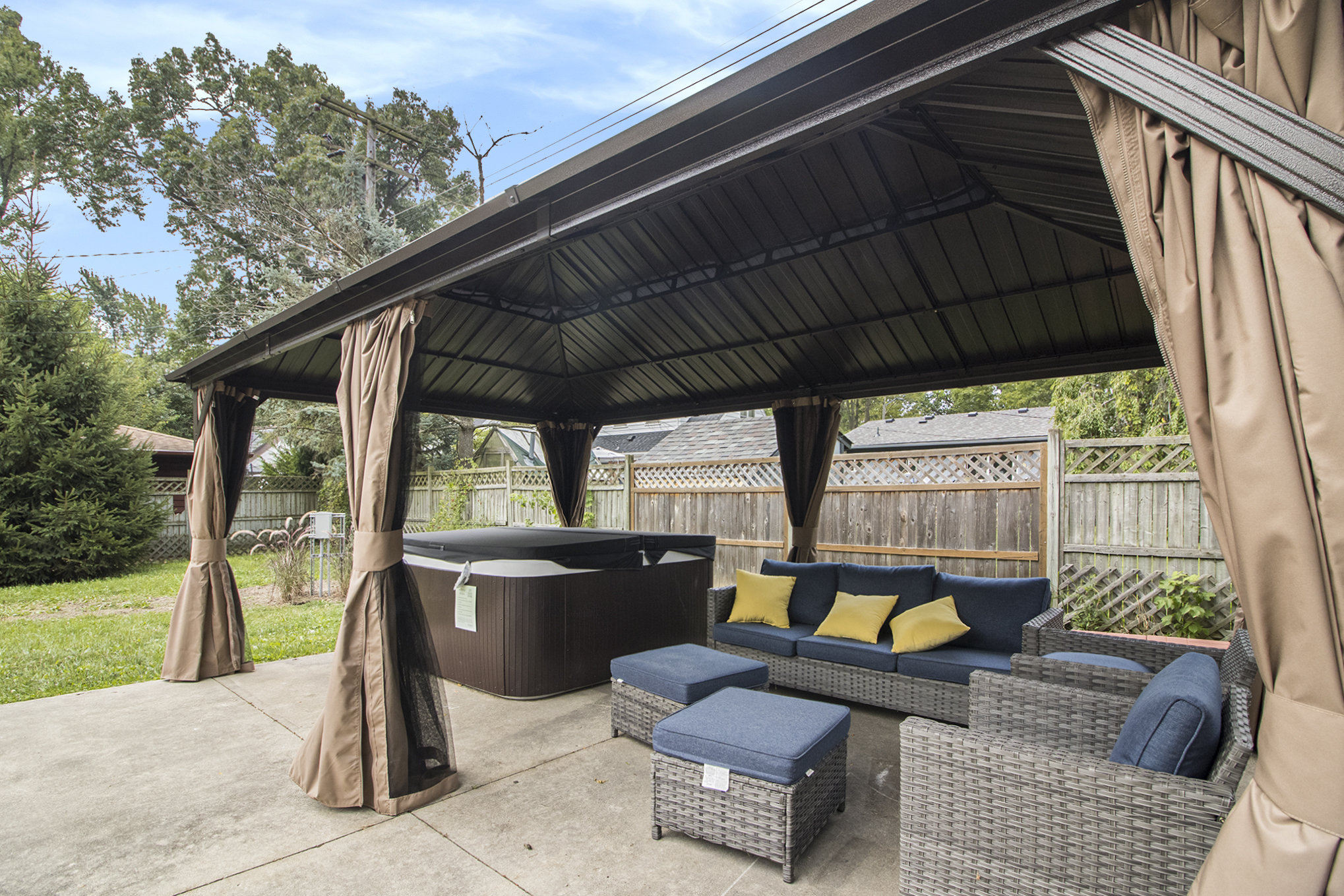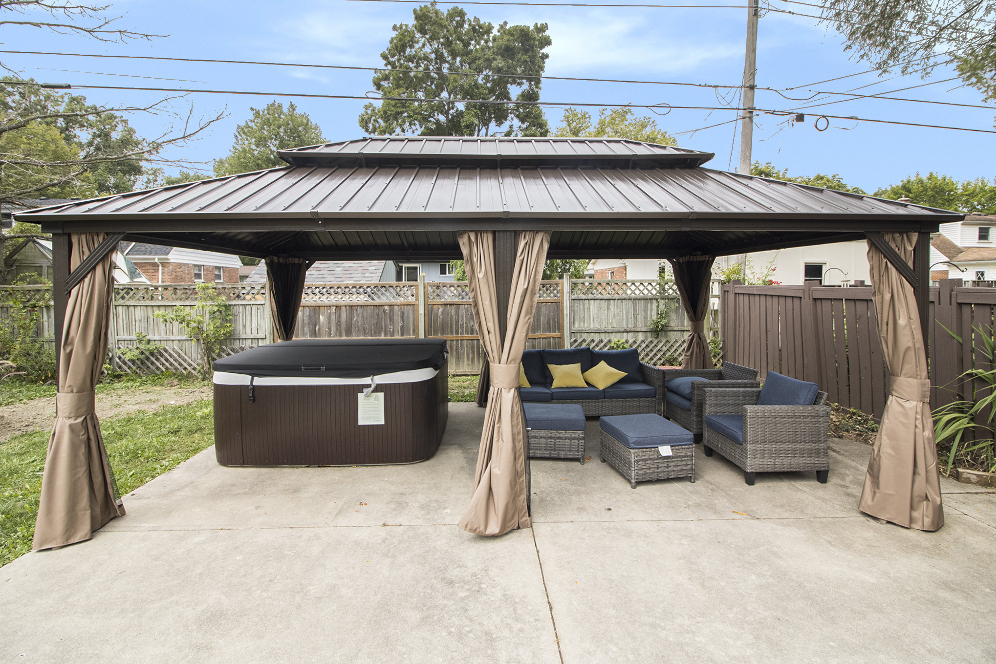 The backyard is a private outdoor haven, providing a lovely escape with many amenities and the dreamy fire pit as its centerpiece.