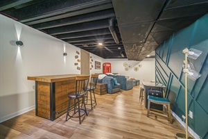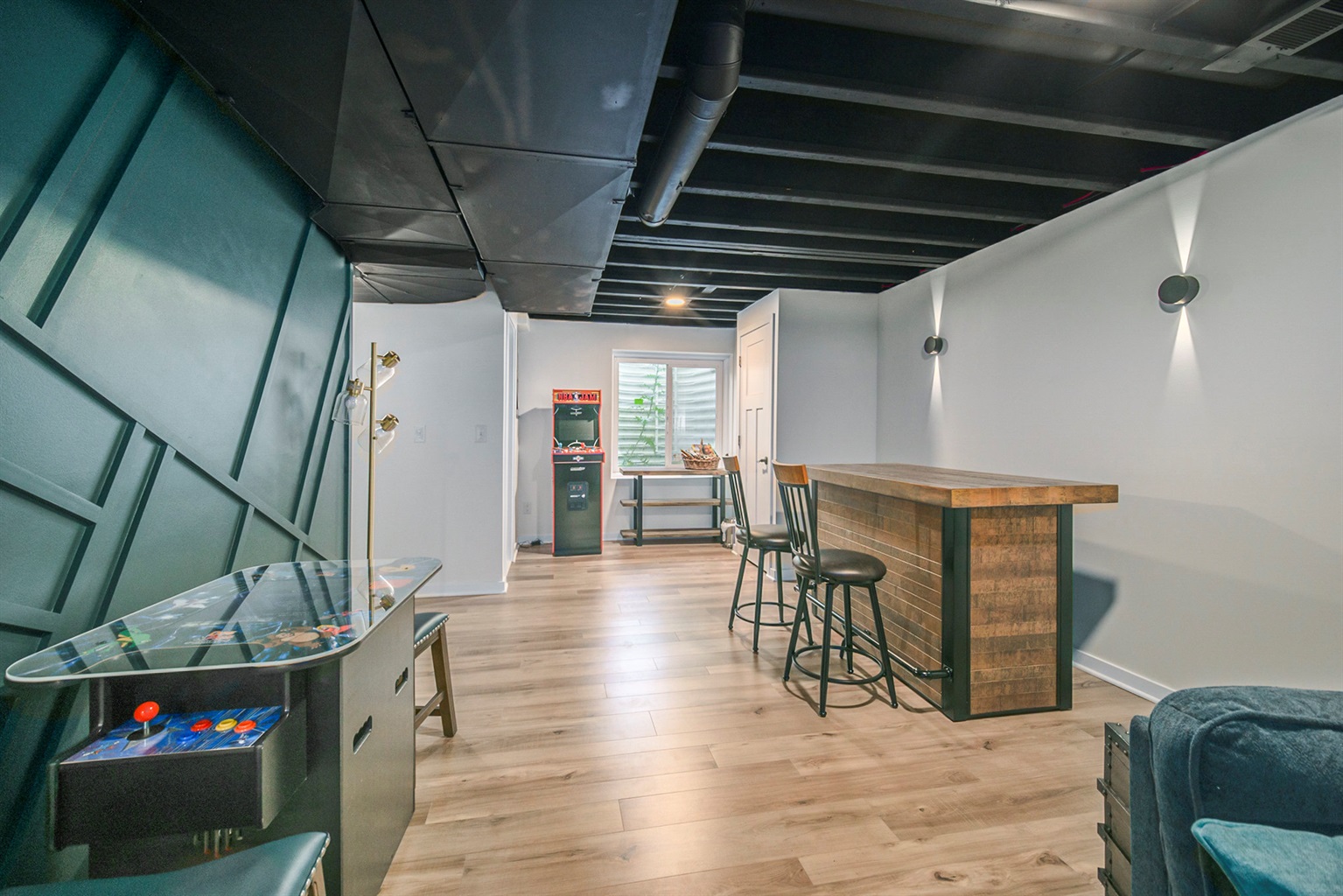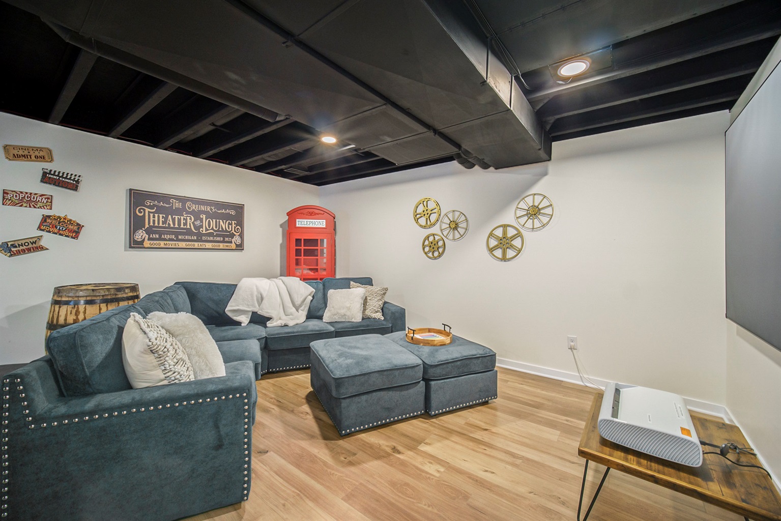 The basement boasts another spacious family room, which serves as a hangout space, ideal for a movie marathon.
